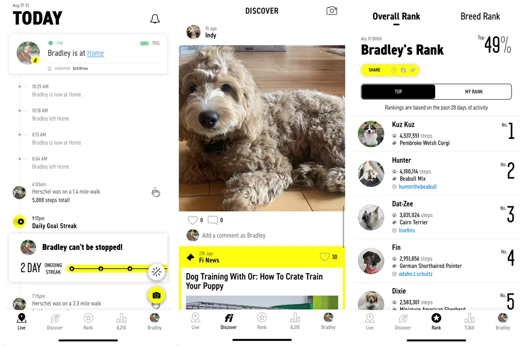 What sets Fi apart is its combination of tracking and fitness insights. The app acts like a smartwatch for your dog, monitoring daily activity levels, comparing performance with other dogs of similar breeds, and even sending escape alerts if your dog leaves a designated safe area. Fi is ideal for tech-savvy pet parents who want complete visibility into their pet’s life.